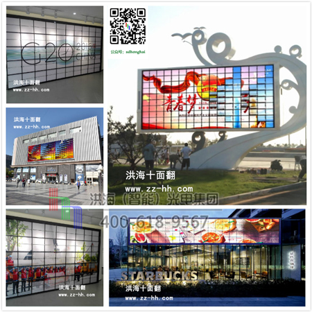 机械翻页十面翻告别了传统的机械传动,取而代之是数控智能控制系统的应用,化腐朽为神奇,以其波澜壮阔的新奇和动感效果横空出世,在视觉疲劳中给人以清新、怀旧但又与众不同的视觉感受。好的元素用于建筑、装饰、场馆、舞台和户外广告,让建筑动起来,就会赋予灵魂和创意,带来更多价值。 创意无止境,广告无边界,洪海光电集团带您进入时尚广告前沿,来吧朋友们,与洪海共舞,打造您的财富空间!!!