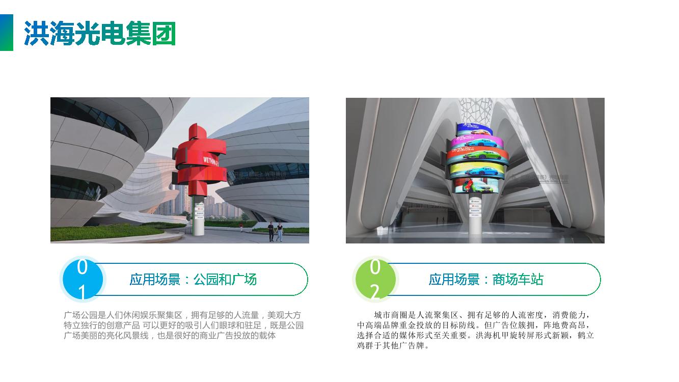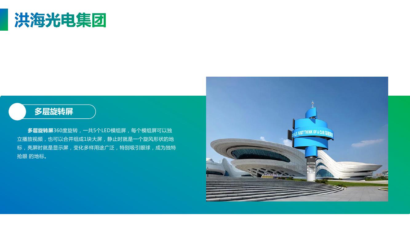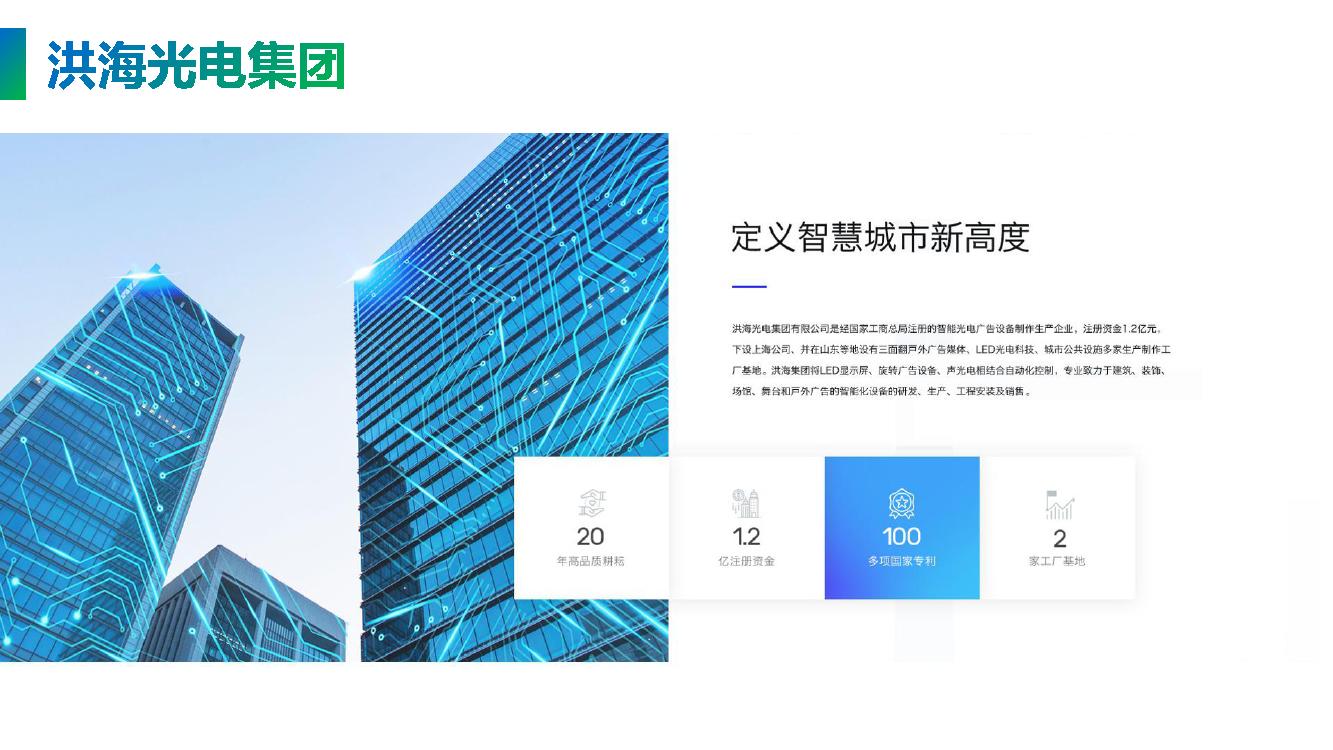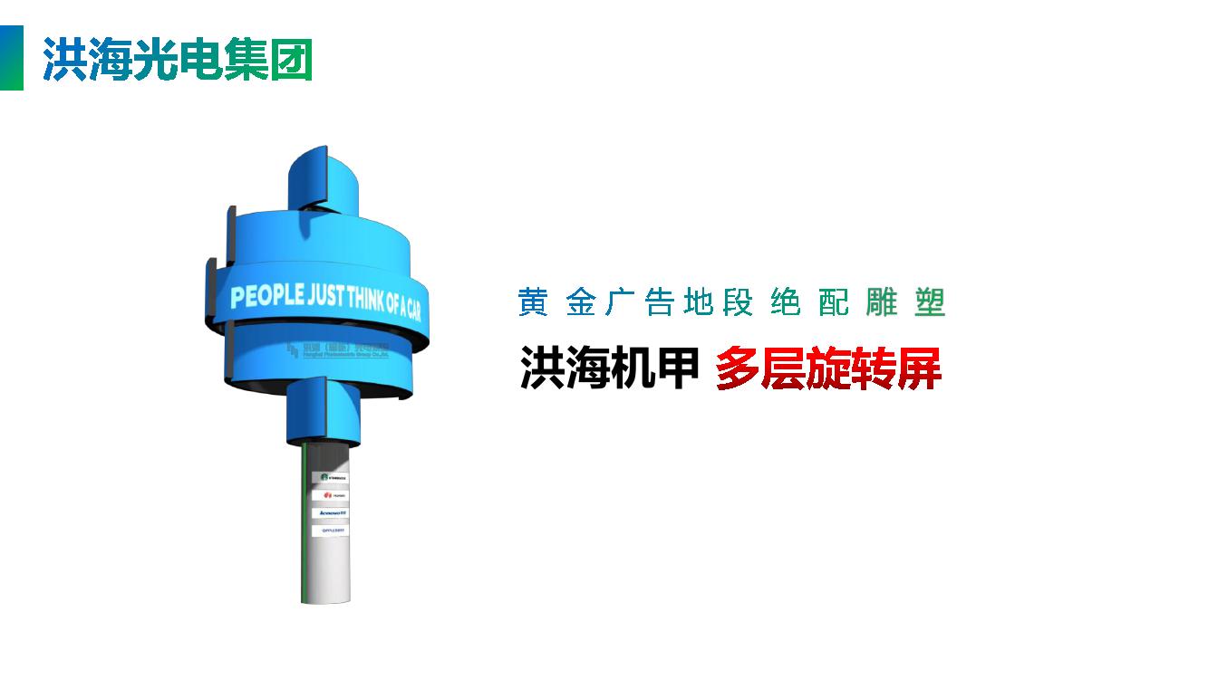 洪海光电集团有限公司 是一家专业致力于智能景观动态LED显示屏的研发,以智能机器人高端宣传设备为研究方向,我们将机器人的机械运动美学和LED智能显示相结合,创造出系列智能广告和展示设备,实现显示屏的旋转升降、伸缩、变形、无线传输、远程控制、人机互动等现代智能化元素,为智慧城市提供全套的城市景观、户外广告、机械幕墙配套的技术服务方案。 总工程师史洪海先生获200多项国家专利,是受聘于中国青年创业国际计划的青年创业导师和大学产业教授,在中国智能光电行业中具有非凡的创造力和举足轻重的地位。