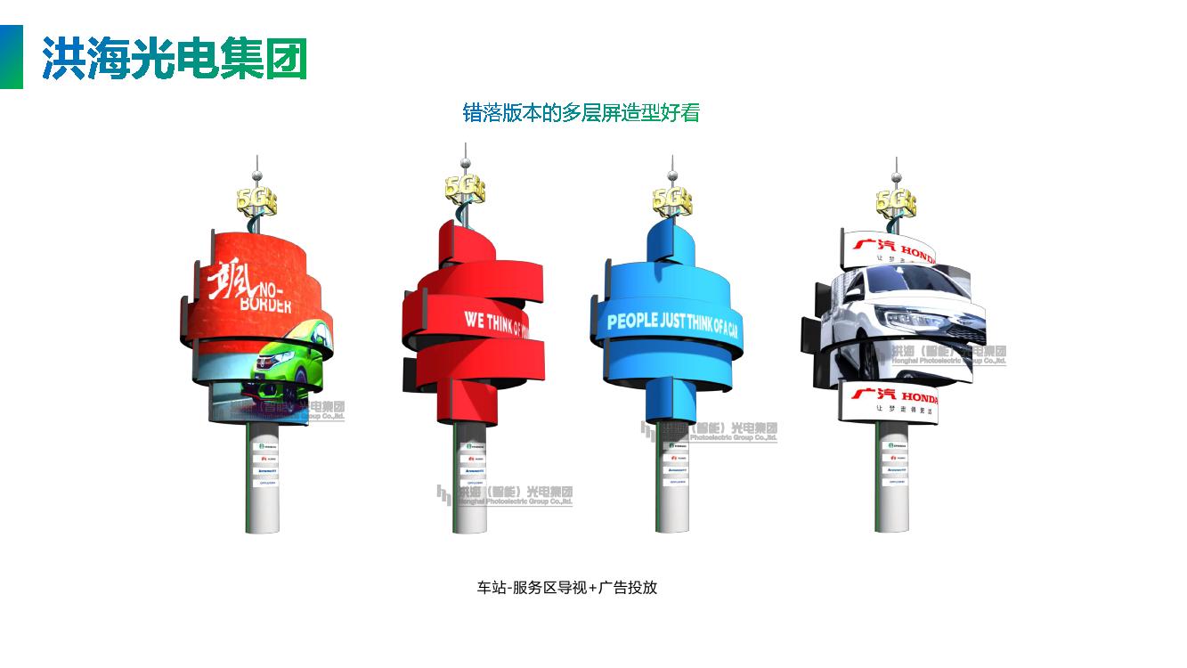 多层旋转屏360度旋转,一共5个LED模组屏,每个模组屏可以独立播放视频,也可以合并组成1块大屏,静止时就是一个旋风形状的地标,亮屏时就是显示屏,变化多样用途广泛,特别吸引眼球,成为独特抢眼的地标。