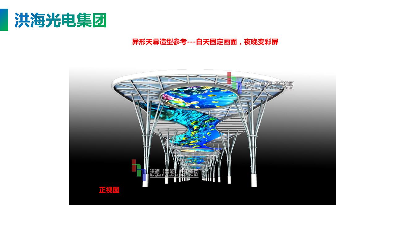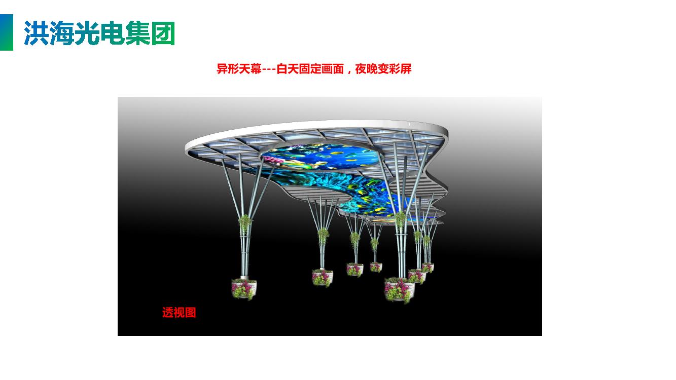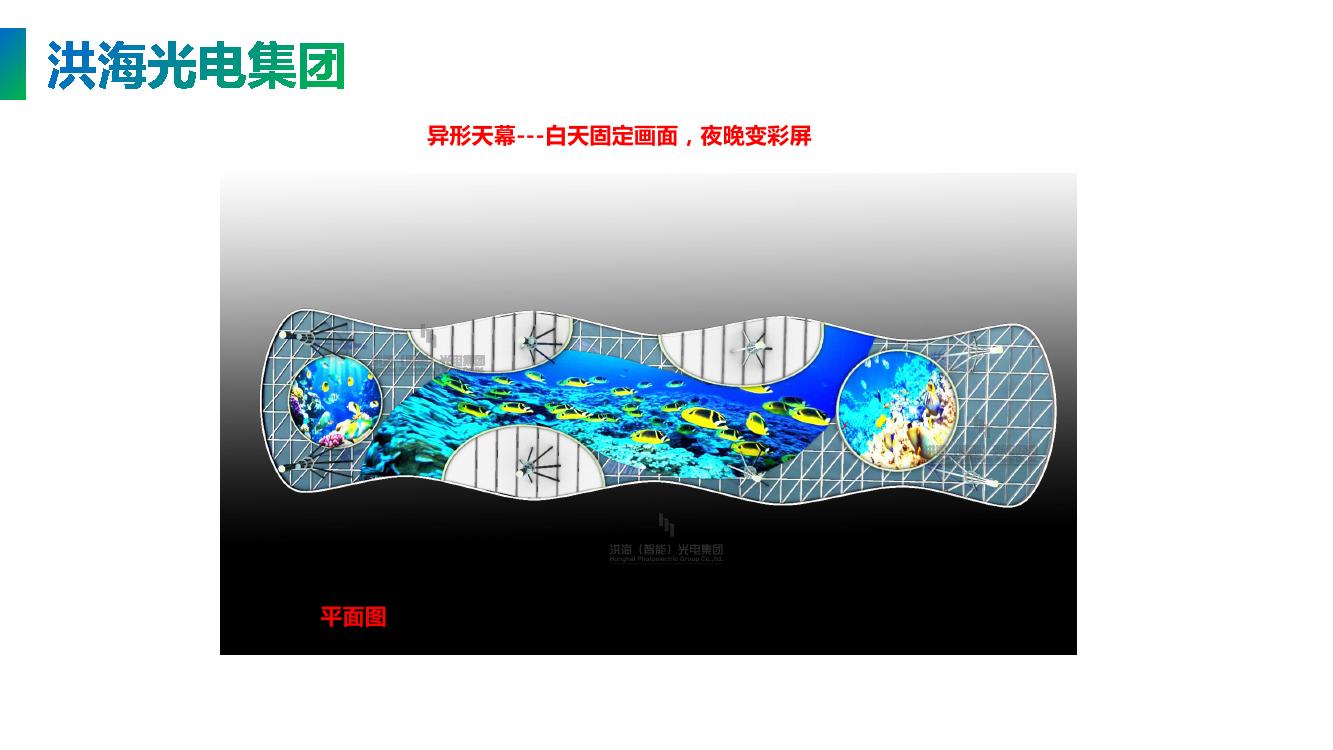 洪海LED天幕(彩色矩阵天幕)以其弧形式的设计占据整片外墙,蜿蜒起伏,白天具有很好的格栅装饰效果,到了傍晚LED点亮,以其磅礴的视频展现多彩的世界,在渲染商业地产氛围的同时,聚集人气提高商业地产的价值。