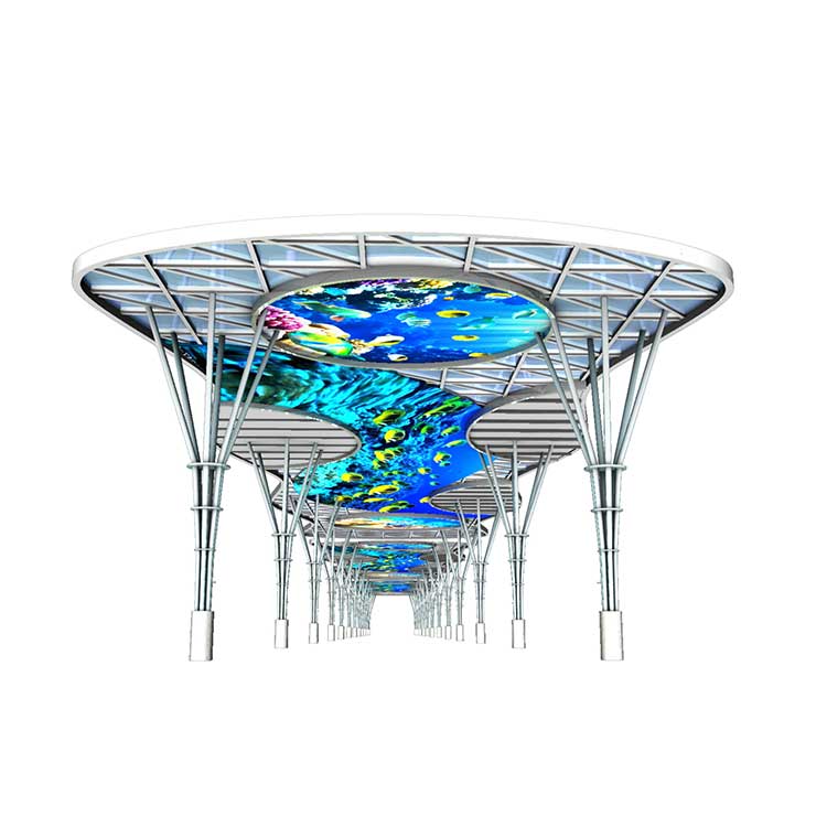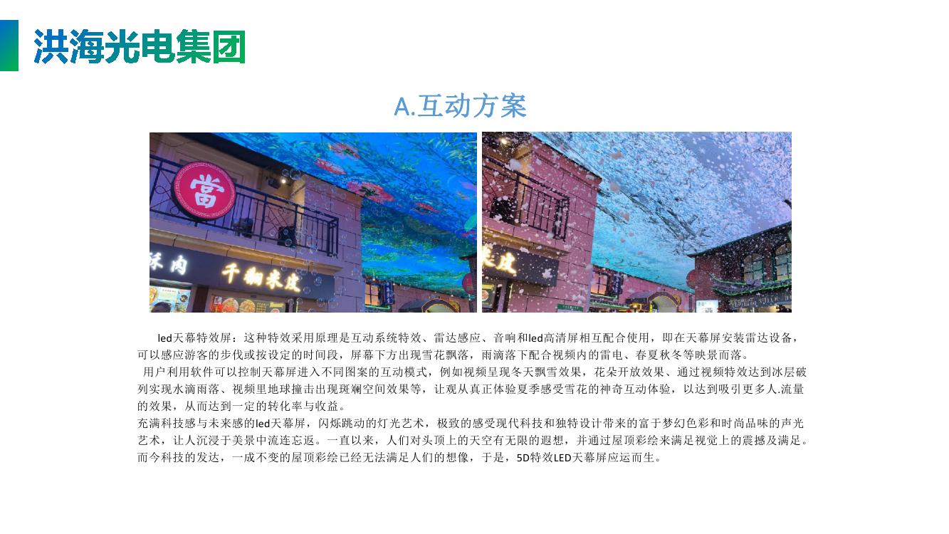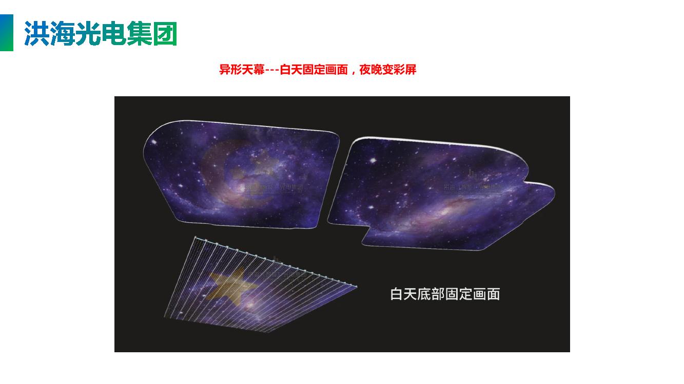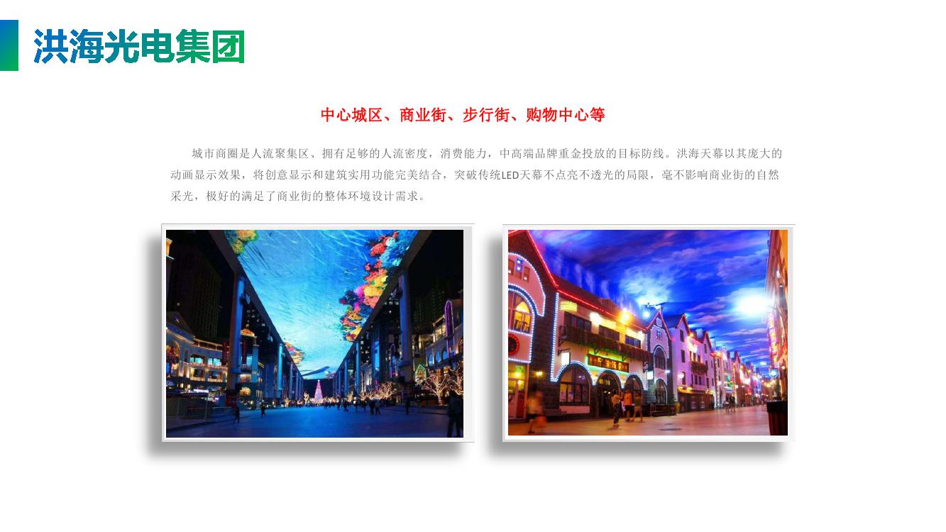 洪海LED天幕(彩色矩阵天幕)以其弧形式的设计占据整片外墙,蜿蜒起伏,白天具有很好的格栅装饰效果,到了傍晚LED点亮,以其磅礴的视频展现多彩的世界,在渲染商业地产氛围的同时,聚集人气提高商业地产的价值。