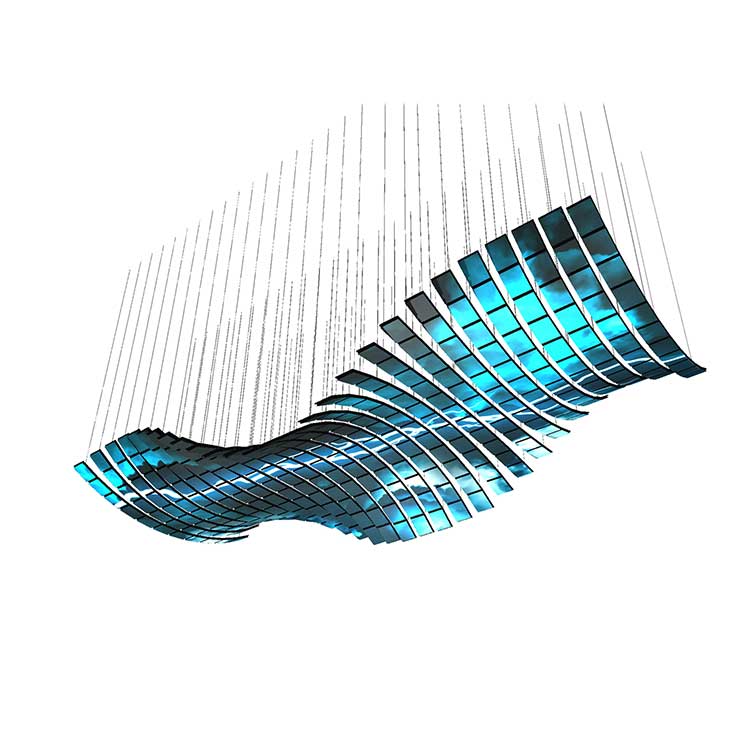 悬浮天幕----每个单独模组由八根绳索吊挂上下起伏变换造型